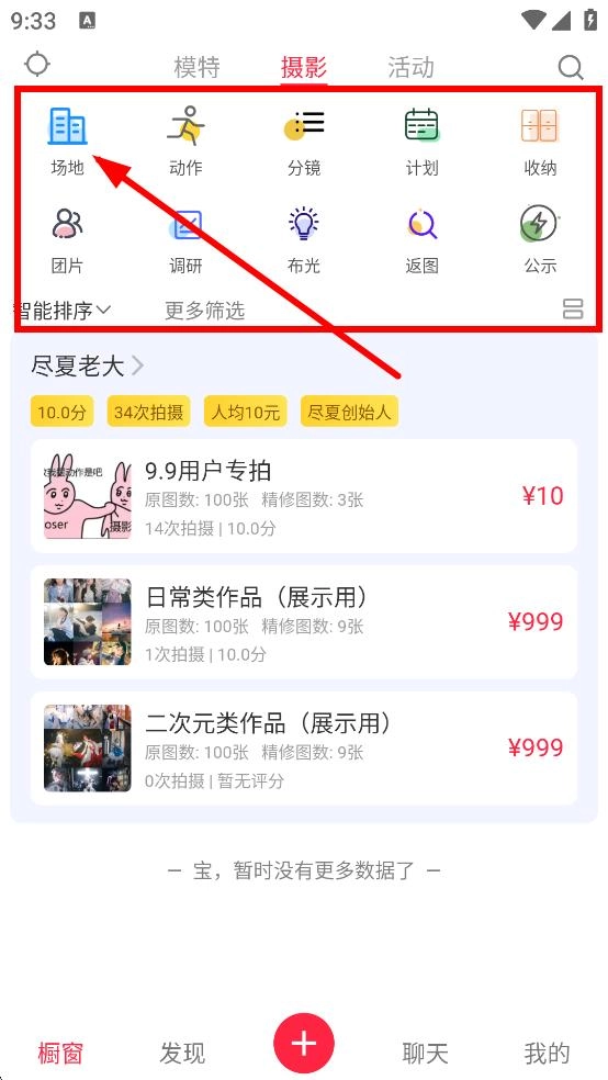 1、在摄影的分类下,点击场地,进入场地选择页面。