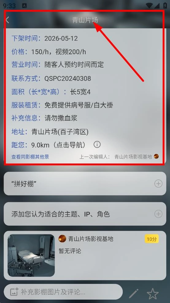 3、进入场地详情页,可查看青山片场的价格营业时间等信息。
