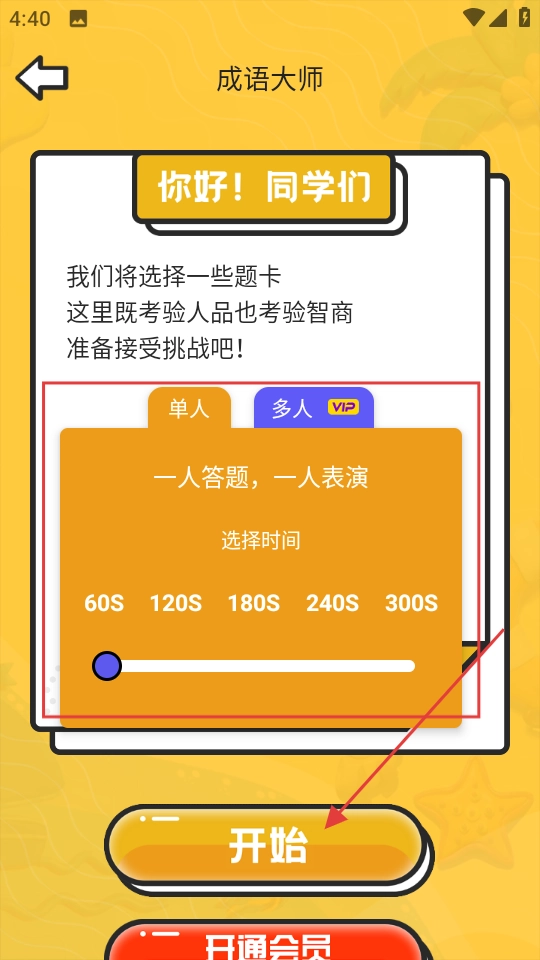 2、在成语大师页选模式和时间,点击开始。