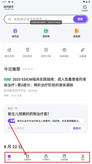 1、打开用药助手应用,点击底部合理用药图标,进入合理用药页面。