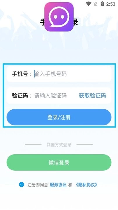 3、登录注册时,可通过输入手机号验证码的方式来完成。
