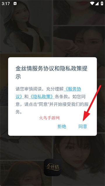 在本站下载金丝情app,下载完成后打开该应用,进入界面后点击同意相关条款或提示。