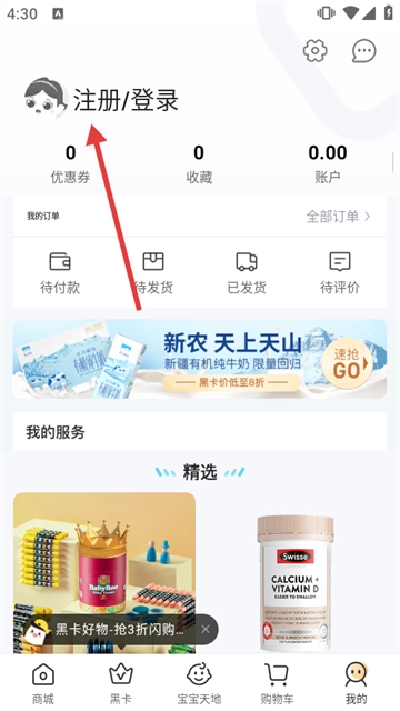 2、在“我的”页,点击【注册/登录】进入登录界面。