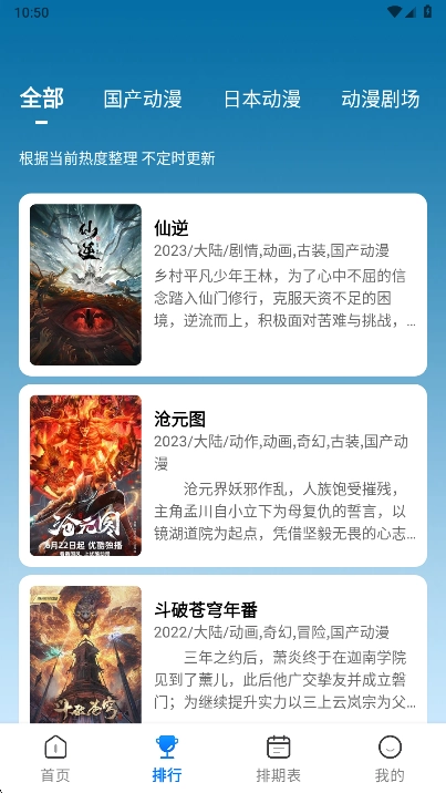 3、实时更新漫列表,查看不同动画在列表中的热门排名。
