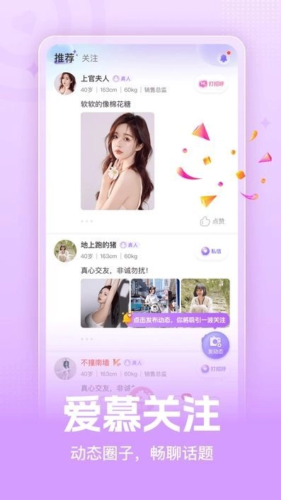 2、具有简洁直观的用户展示以及真实日常的动态分享这两大特色,能够满足结识新人、同城互动、关注好友等需求。