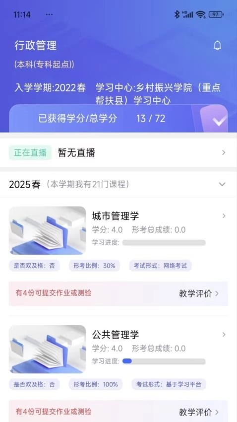 3、留意课程学习进度,知悉学习状况以及所获学分,同时可在线对教学展开评价。