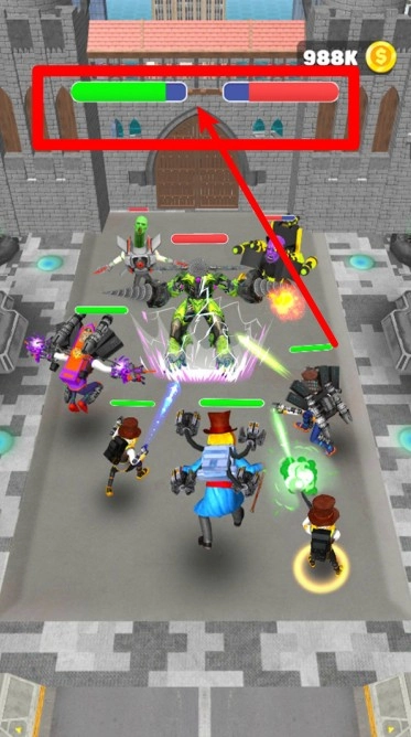 2.双方顶部会出现血条,绿色代表我方,红色是敌人,战斗过程中会随伤害实时减少直到一方失败。