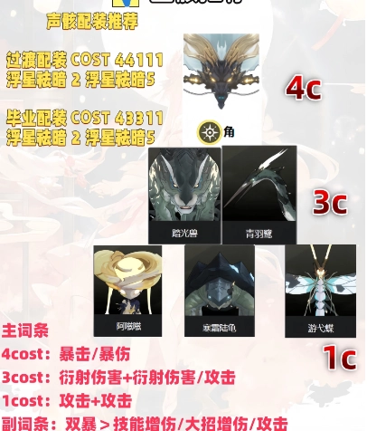 出自黑海岸阵营,身边常出现象征光明与黑暗的双羊形象。性格开朗活泼,但内心深处隐藏着对黑暗的恐惧。刚开始时,可选择紫鸟(cost3)作为主要声骸,完成支线任务后,要是能得到摩托声骸,建议优先替换,以此强化战斗节奏感。在主词条搭配上,cost4优先选择双暴,cost3搭配火属性加成,cost1则以攻击百分比为宜。过渡配置可采用44111组合,最终毕业配置推荐43311。副词条按双暴、攻击百分比、普攻加成、小攻击的顺序优先选择,此养成路径适用于稳定输出型火属性角色。