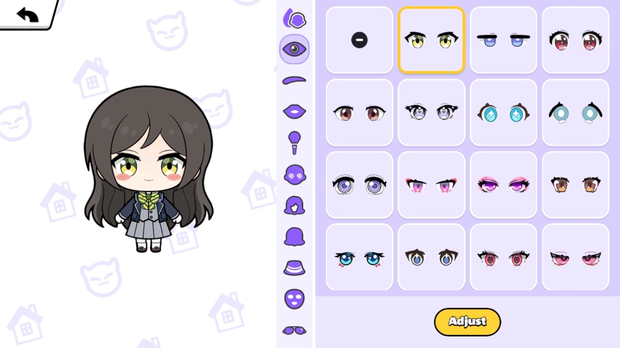 4、挑选一件装扮后,点击下方的“Adjust”,即可进入微调界面,对装扮的位置、尺寸等进行调整。
