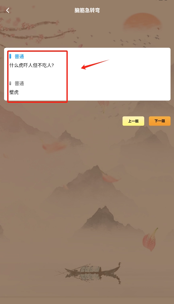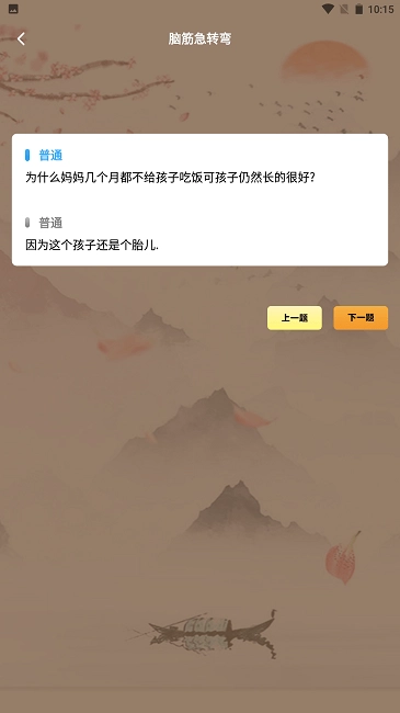 2、看山水背景的脑筋急转弯,选普通难度答题,可翻看上一题下一题。