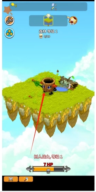 1. 画面呈现游戏初始的战斗场景,一片浮空的草地岛屿映入眼帘。此处显示森林等级为1,怪物是树人战士,同样等级为1 。同时,界面上清晰展示血量、道具等相关信息,随后开启冒险战斗流程。