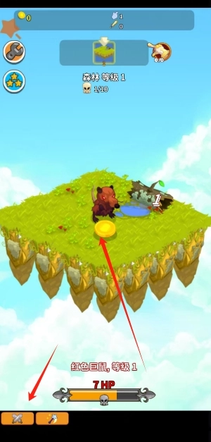1. 展现战斗进程场景,出现浮空的草地岛屿,森林处于1级状态,怪物变为1级红色巨鼠。界面上显示金币掉落情况,同时有血量标识与操作按钮辅助战斗,推动冒险流程不断前进。