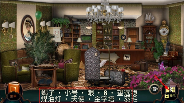 3、按照游戏下方的提示,在接待厅收集所需物品。此外,玩家也能够依据右下角的提示寻找到物品。