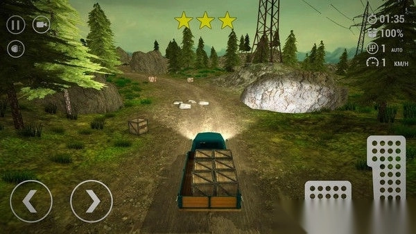 2、用右侧虚拟按键控速,避障碍(石头/木箱),沿山路行驶,保三星,赶时间(01:35)。