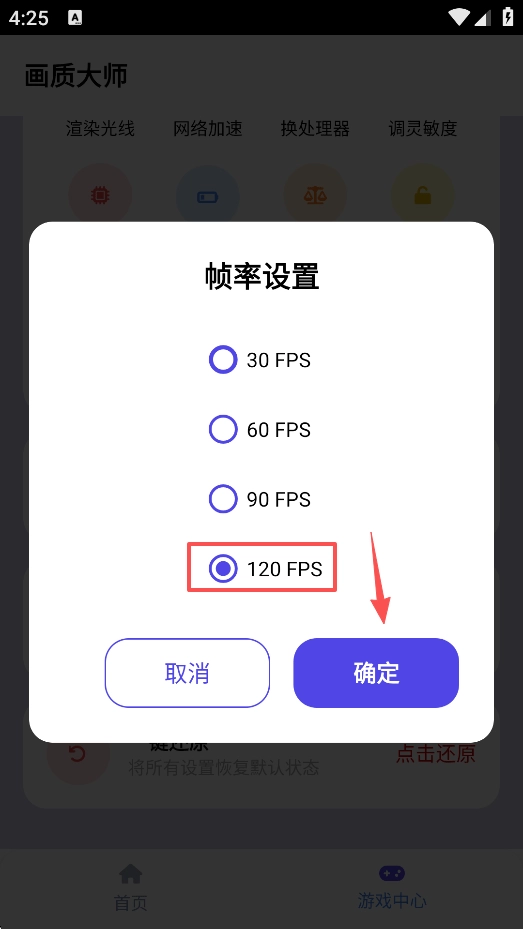 2、进入打开的帧率设置页面,选中【120FPS】,然后点击【确定】就可以了。