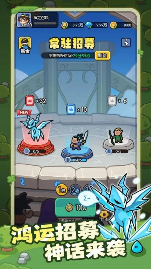 1、该游戏核心玩法为召唤与合成。玩家进入游戏后,英雄会随机刷新,召唤出的英雄还能进行二合一合成操作,从而得到更为强力的英雄。