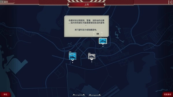 4、接下来便进入上岗状态,等待突发事件发生。一旦事件出现,你要调派相应的队伍去应对突发事件并完成处理工作。