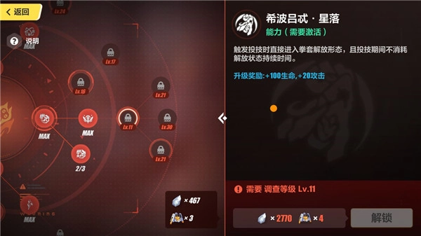 在右侧一栏里,“星落”能使卡萝尔进入拳套解放状态,并且在该状态期间不会消耗解放状态的时间,建议在11级的时候就将其点出。(下图是关于解放状态的讲解)