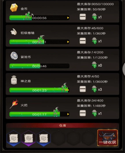 4、在矿洞之中,除了能够获取金币,还可得到诸如初级卷轴、冒险币、神之息、火把等资源。