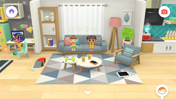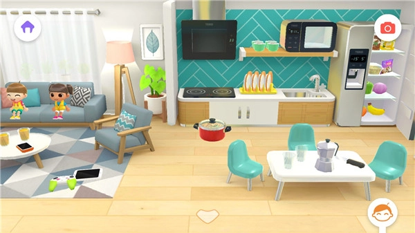 4、进入场景,映入眼帘的是家居生活场景。在此场景中,你能够点击卡通人物,让其进行玩耍、做饭等活动。