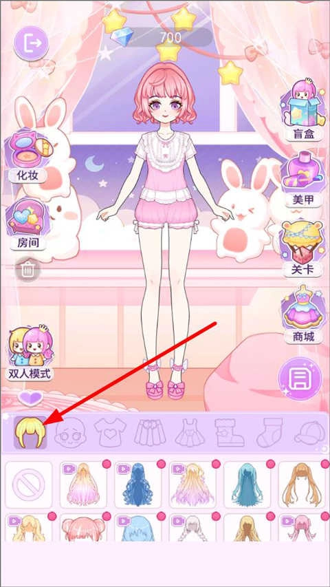 2、踏入装扮房间,玩家能够为人物进行化妆、美甲操作,还能开启双人模式等。在下方工具栏点击,即可挑选人物发型。