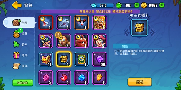 玩家能够在背包里查看自身拥有的碎片、消耗品等道具。其中,时效宠物和时效英雄仅能在一定时间内使用,不过依然能够进行英雄觉醒。下次使用该英雄时,会继承上一次的觉醒星级,所以玩家大可放心培养自己喜爱的英雄!