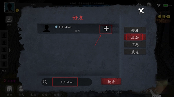2. 打开之后,点击添加功能,接着在下方的搜索框里输入好友名字来进行搜索,搜索出来后点击“+”号添加。