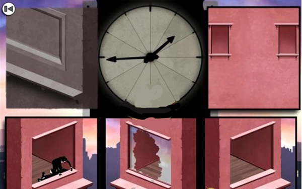 途中需进行一次调整,首先依照下图排列画面,务必调整大时钟的时间。另外,窗户会被打破,玩家要将警察放倒。