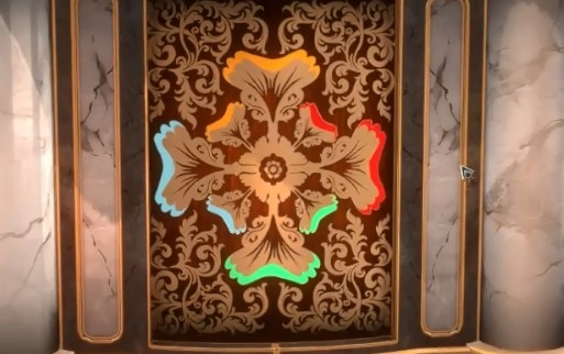 3、把镜头转换到面具背后的区域,点击中央的装置,转动转盘,使两侧的板块滑进中央的卡位。