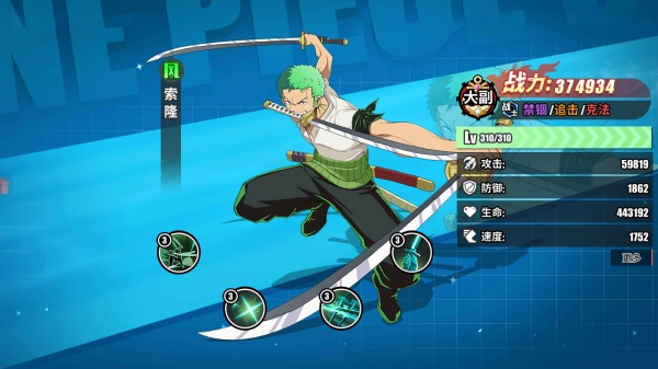 3三技能【世界第一大剑豪】:若索隆率先出手,自身伤害与暴击率将得到提升;若并非率先出手,每次攻击都有一定概率额外攻击一名敌方角色。