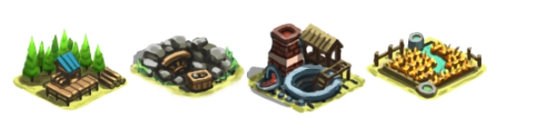 2、资源共分为四类,分别是木、石、铁、粮。其中,木由林场产出,石由石矿产出,铁由铁矿产出,粮由农田产出。