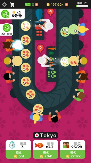 这是一款放置类模拟经营游戏,游戏里餐厅的美食是源自日本料理界的回转寿司。身为这家店的店长与管理者,你得持续解锁并升级知名主厨,以此为店铺创造更高的资金收益。由知名料理主厨制作的美味寿司,会吸引更多顾客前来消费。当你的资金达到一定数额,就能够升级餐厅,增加餐厅内的座位,让更多客人可以入座,这对餐厅经营有着颇为可观的效益。
