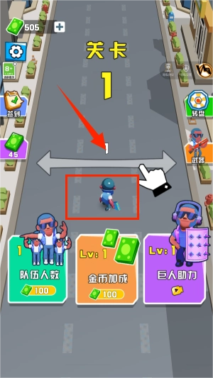 1、通过控制屏幕左右方向,进行跑酷,获得道具奖励进行射击。