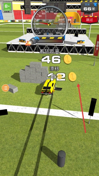 2、冲坡后,空中吃金币(黄色$),触发漂移(12倍),延长着陆距离(46米)。