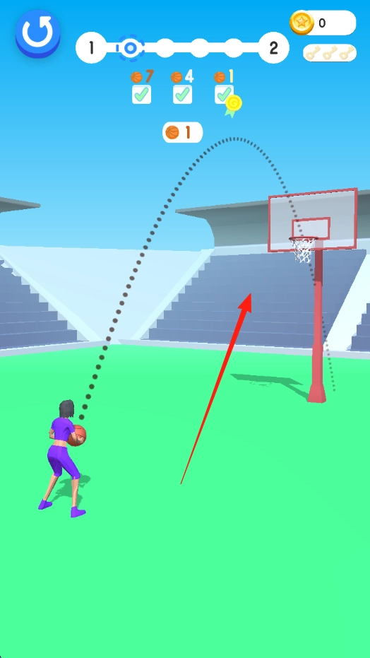 1、操作机制长按屏幕拖动,规划紫色角色的投篮轨迹(虚线),松手让篮球沿轨迹飞向篮筐。