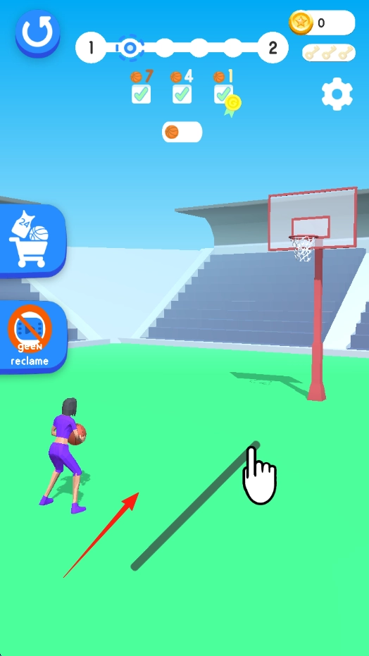 3、场景与道具在篮球体育场,利用轨迹调整,避开障碍(如篮筐移动),收集金币(当前0),强化角色或解锁皮肤。
