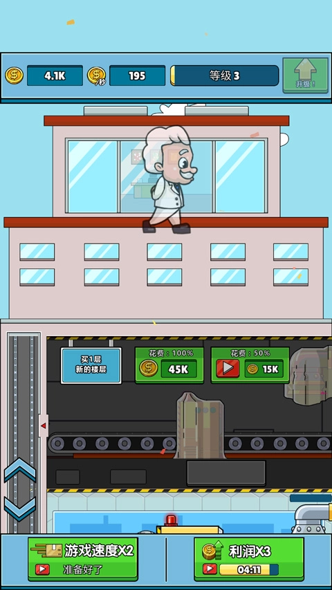 初次规模形成后,玩家就能开始运营这款游戏。运营时,所有产品制作完毕,就可以去运输售卖。需要注意的是,整个生产过程以及游戏进度都是自动推进的,玩家只需在资金达到一定数量的前提下,对楼层和工人的生产速度进行升级即可。