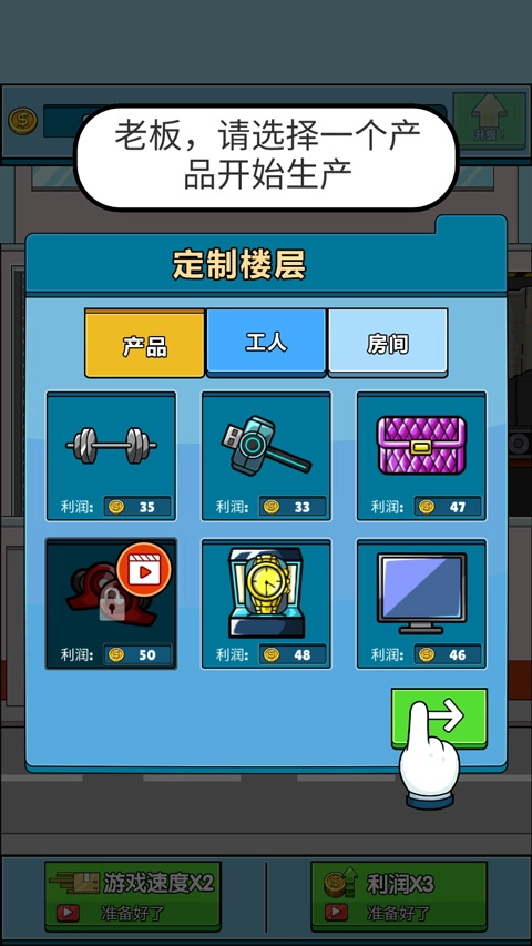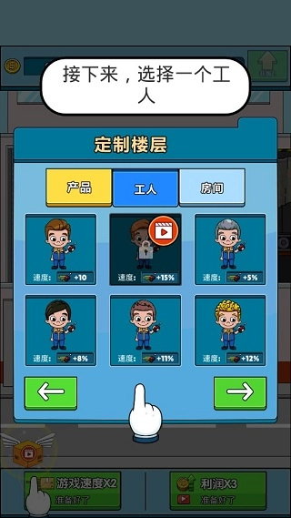 1. 开启运输大亨手机汉化版本,轻点屏幕即可开始。此时,玩家需要对楼层进行定制,涵盖楼层所生产的产品、配备的工人以及房间等方面。