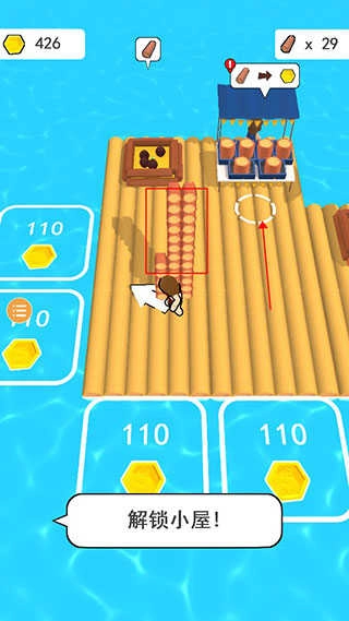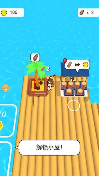 3、通过售卖木头获取大量金币后,走到木筏边缘,用金币拓展自己的领地。