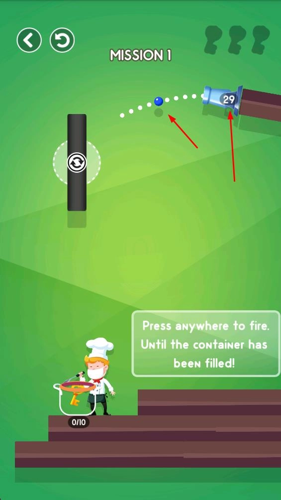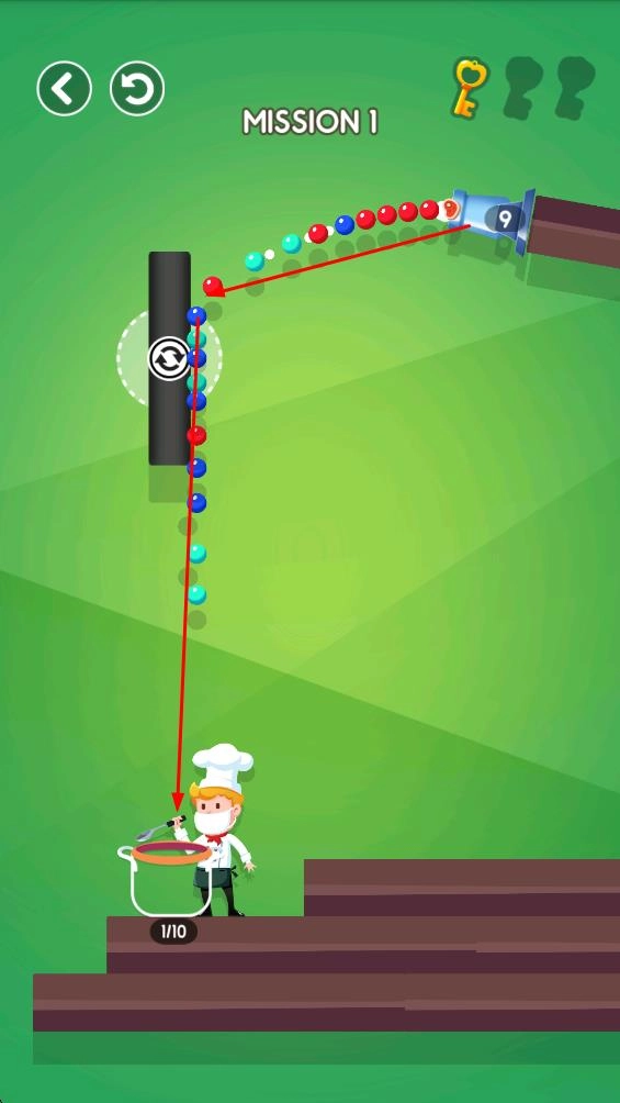 3、让彩球在受到黑色物件阻挡后,掉进厨师前方的容器中,实现收集数量的目标。