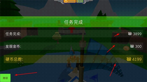 4、当完成任务后,系统会展示任务完成界面,此界面会呈现任务奖励、发现金币数量以及硬币总数。用户点击“继续”按钮,即可进入下一个环节。