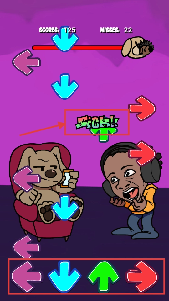 3、当方向箭头向下掉落时,按下与下方对应的【方向键】,若触发【SICK】评价便能得分,要留意箭头的节奏。