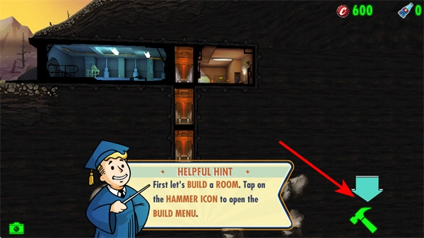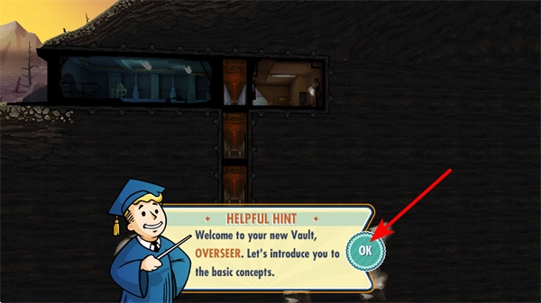 1. 轻点提示框里的OK按钮,关闭欢迎提示,正式开启避难所建设流程。此乃熟悉游戏基本概念的初始操作。