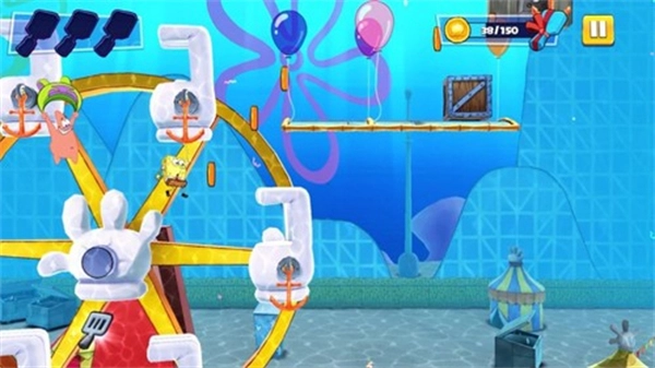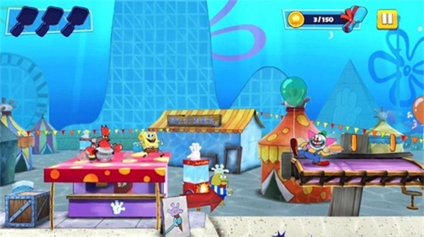 2、场景元素鲜活丰富:关卡不仅包含蟹堡王厨房、水母田花丛等原作场景,还融入了会移动的餐桌、漂浮的气泡等动态元素,高度还原且活力满满。