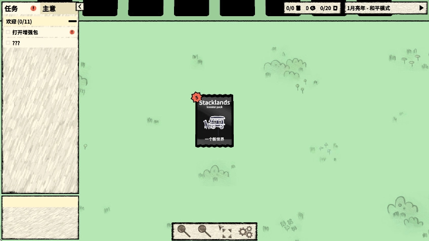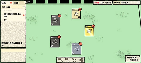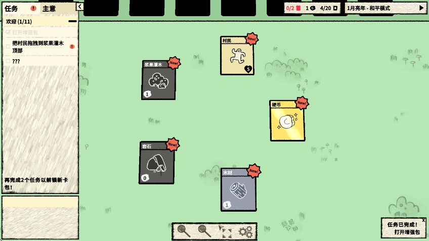 4. 只要完成系统指定任务,你就能获取木材、浆果灌木、村民、岩石以及硬币这五张新卡牌。