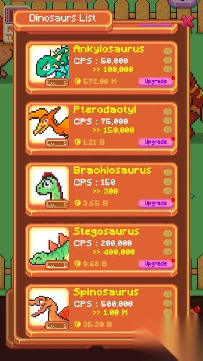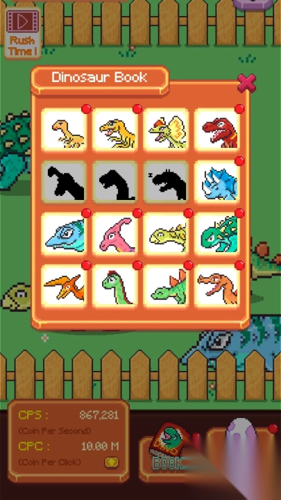 在像素风格的恐龙牧场里,你可以通过持续点击恐龙来提升它们的成长速度,还能精心培育这些史前生物,解锁更多趣味玩法,快来探索这个充满惊喜的牧场世界吧。
