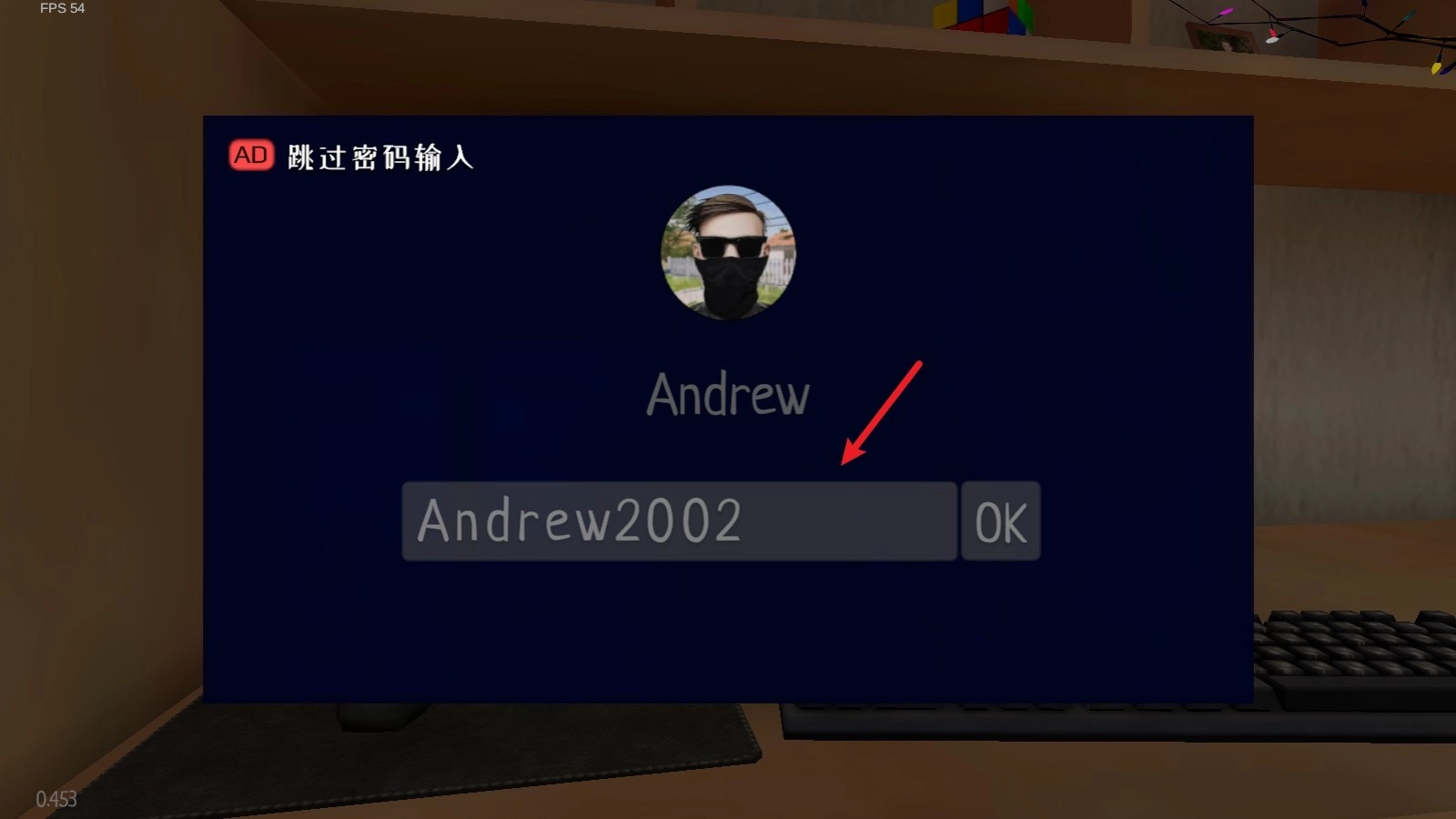 走到个人电脑旁,输入密码“Andrew2002”进入系统。