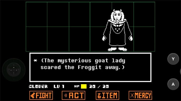 在北面的藤蔓房间里遇到了青蛙froggit,我通过赞美让它变得开心,从而顺利逃离了战斗。之后Toriel帮我穿过了右面水池上方的尖刺陷阱。