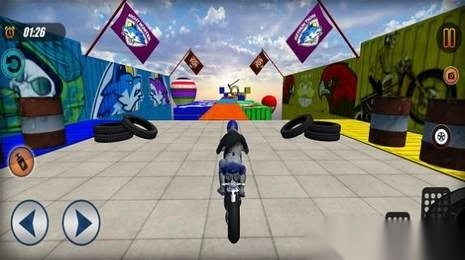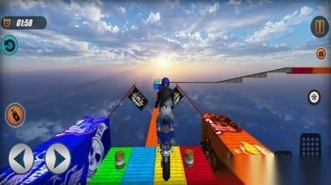 驶入特技赛道,借助虚拟按键操控摩托,疾驰穿过红色跑道,避开各类障碍,顺利完成特技挑战。