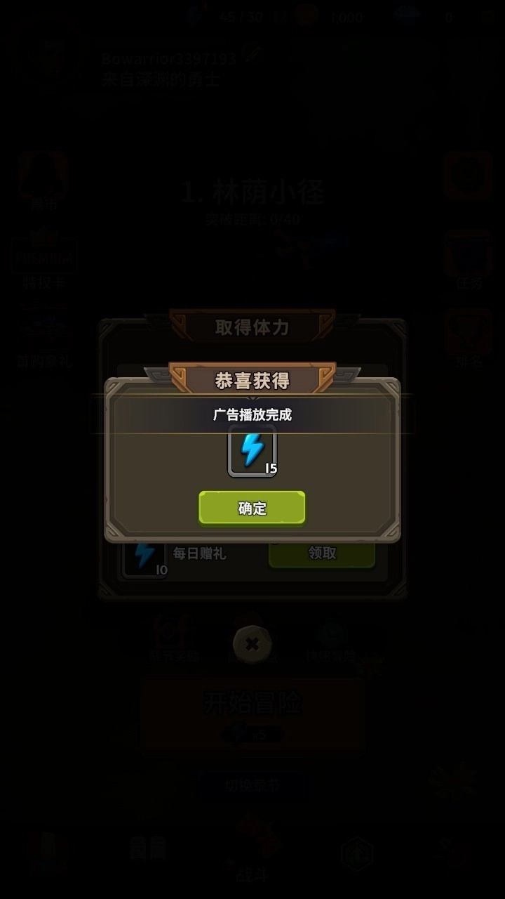 点击体力点击广告,获得奖励。